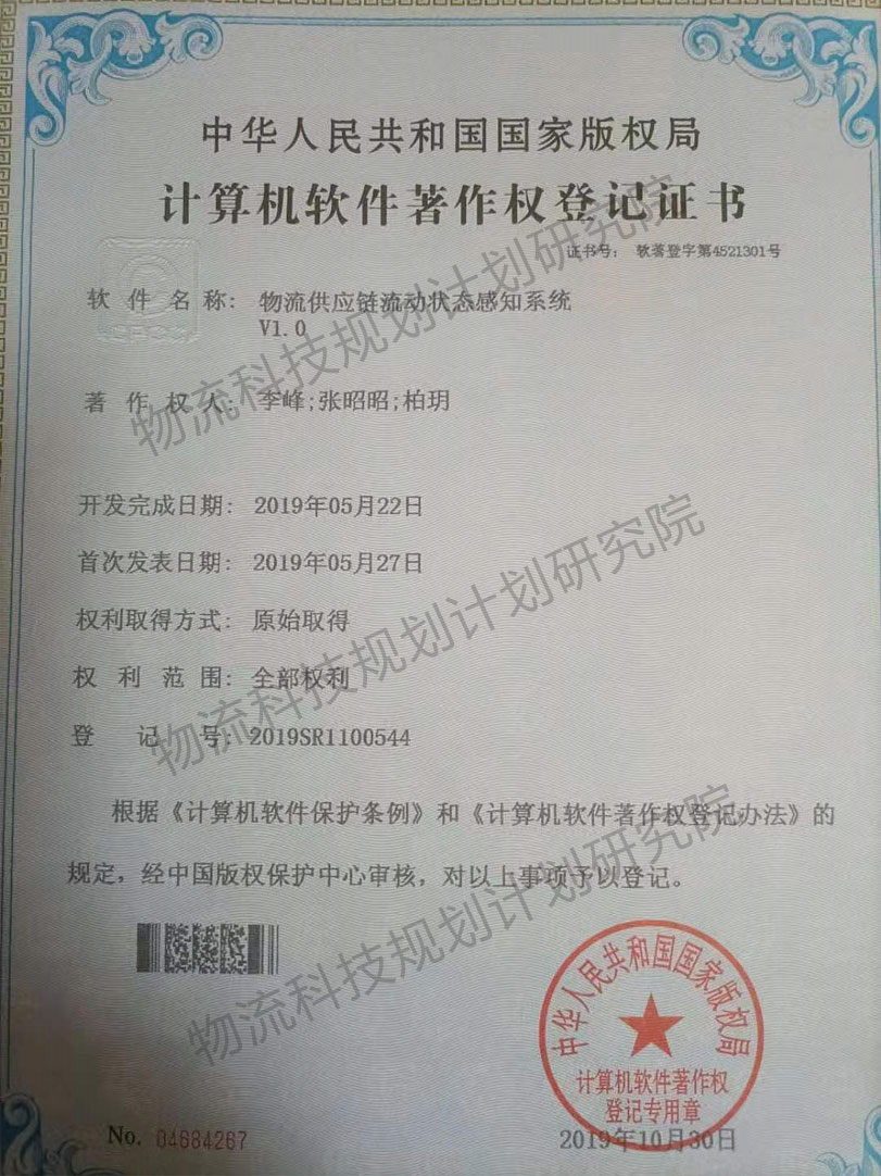 物流供應(yīng)鏈流動(dòng)狀態(tài)感知系統(tǒng)V1.0(證書號(hào):第4521301號(hào))
